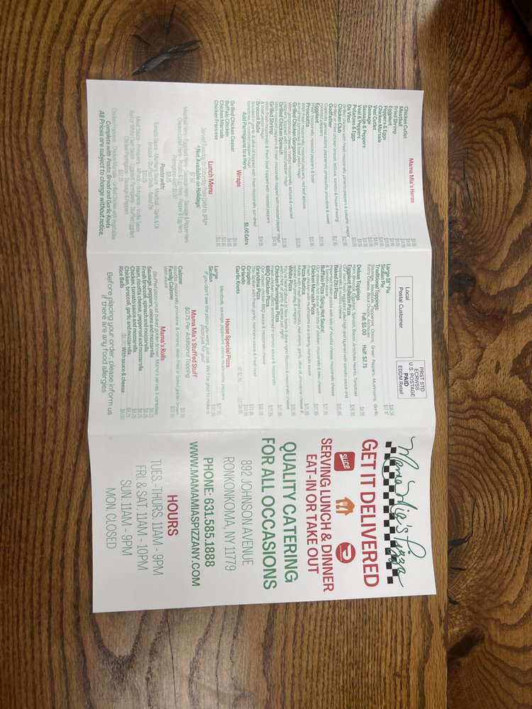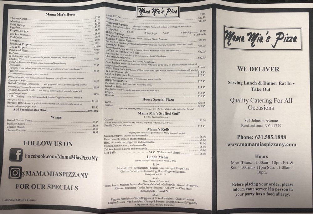 Welcome to Mama Mia’s Pizza, where culinary tradition meets modern flair in Ronkonkoma, NY. This women-owned gem is your go-to spot for mouthwatering pizzas, fresh salads, and hearty soups, available for dine-in, takeout, or delivery. The menu shines with highlights like the Antipasto Al Fomo, a delightful hot antipasto perfect for sharing, or the Fried Italian Sampler, a feast of deep-fried goodness. For those seeking something lighter, the giant Fresh Spinach Salad is an explosion of flavors, featuring crisp greens and succulent bacon.
